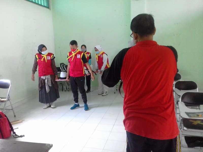 Disimulasikan ada becana alam angin kencang kemudian guru, karyawan, dan siswa berkumpul di titik kumpul dan ternyata ada siswa yang belum ikut berkumpul. Mereka masih ada di ruang kelas dalam kondisi cedera sehingga kemudian tim PMR segera memberikan pertolongan kepada siswa - siswa tersebut. Siswa - siswa yang cedera tersebut dibawa ke mobil ambulance untuk diobati.